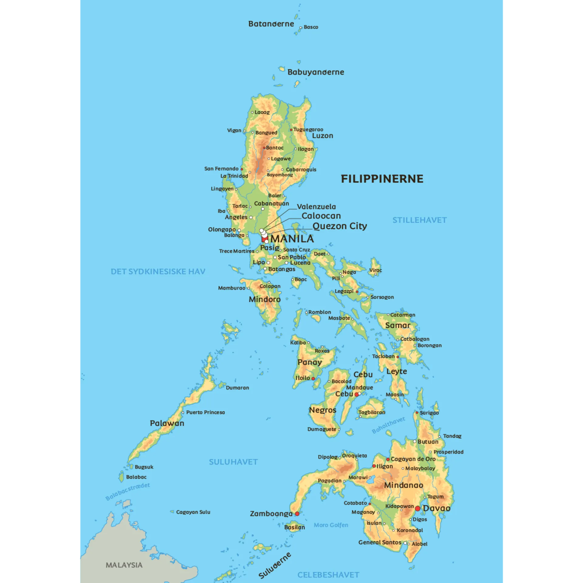Her kan du se nærmere på Filippinerne. Se eksempelvis beliggenheden af hovedstaden Manila på øen Luzon, den største af de Filippinske øer. Se også hvor i Middelhavet du kan finde de andre øer som Mindano, Samar, Negros og Palawan. Disse øer er nogle af de største i Filippinerne, og tager dig igennem den Filippinske natur og skønhed. Så hvor kan du se placeringen af Manila? Find det på kortet.