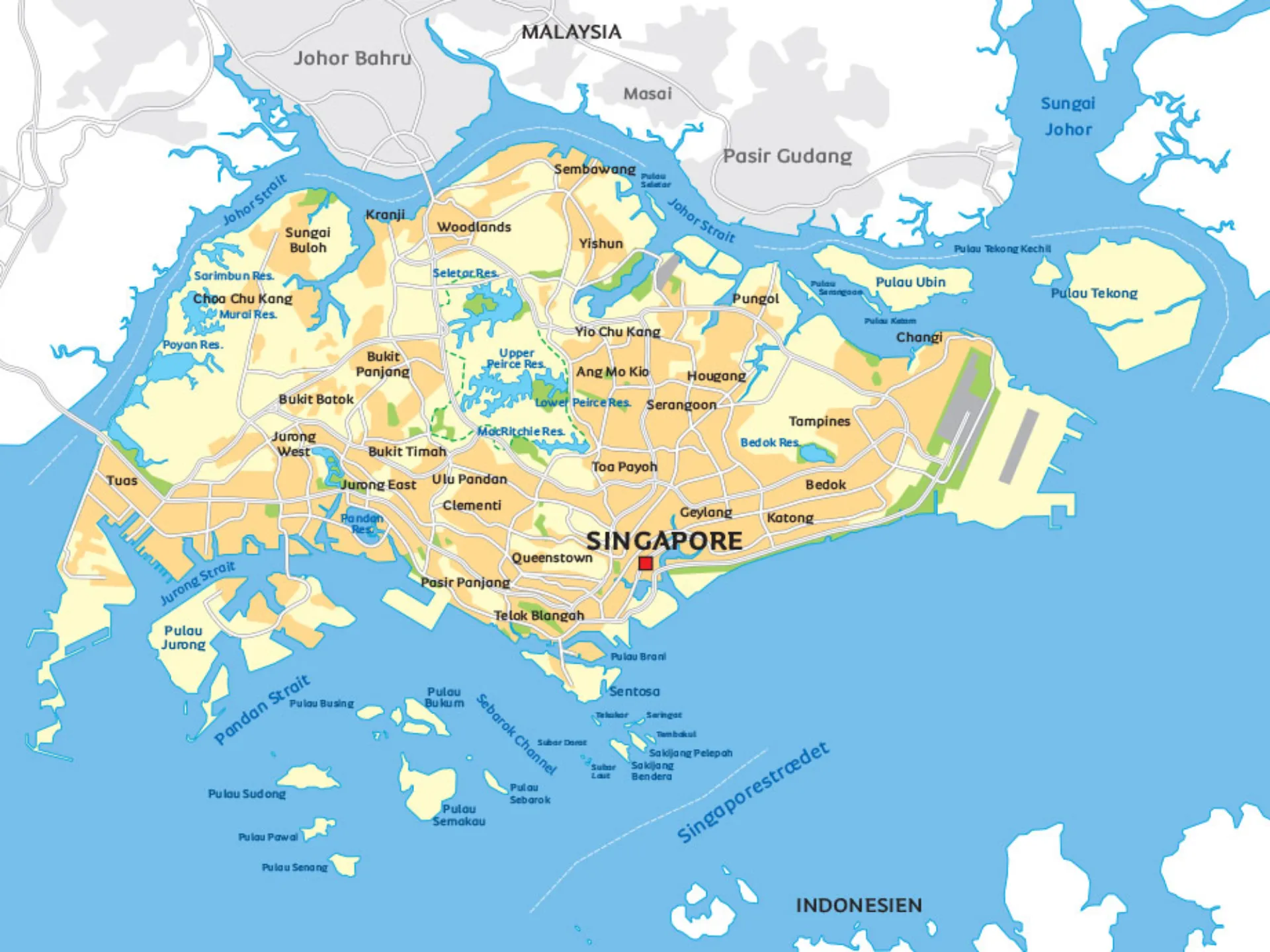 Herunder finder du et kort over Singapore. Se nærmere på øen og se eksempelvis beliggenheden af det legendariske Raffles Hotel. Gå på opdagelse i nogen af byens områder som Choa Chi Kang, Woodlands, Serangoon og Telak Blangah, eller besøg Singapore centrum for at opleve det pulserende byliv. Så hvor kan du se området Woodlands? Find det på kortet.