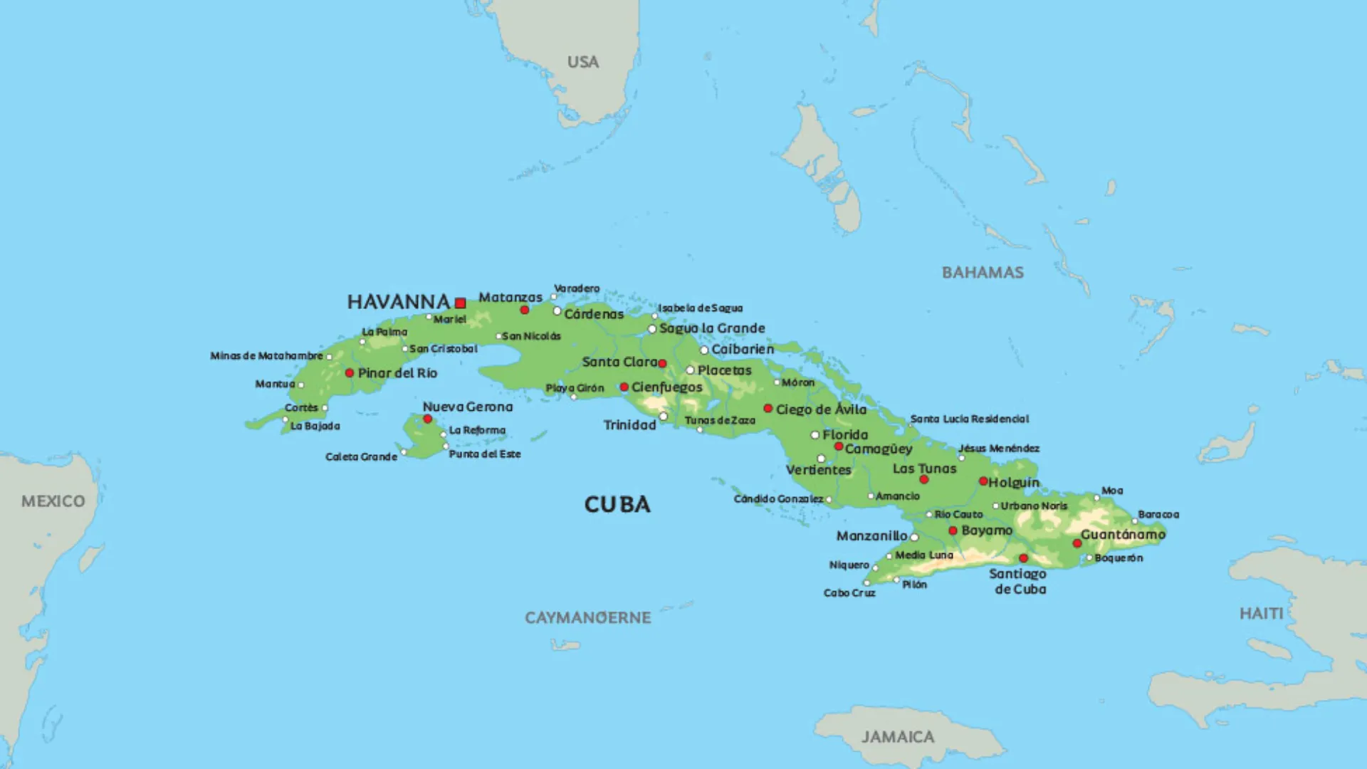 Herunder kan du se et kort over Cuba. Se blandt andet placeringen af hovedstaden Havana og Cienfuegos.