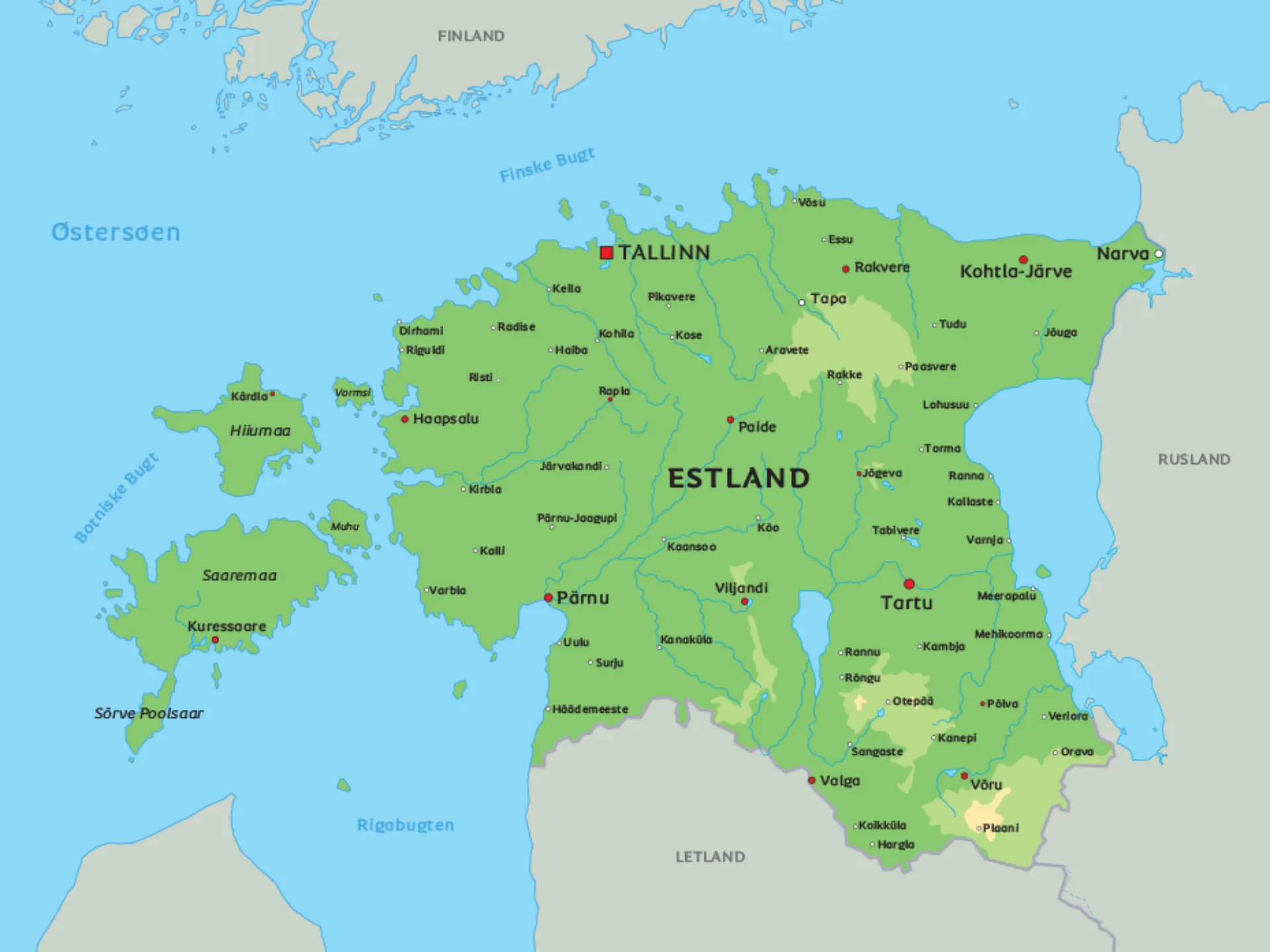 Herunder finder du kort over Estland. Se placeringen af hovedstaden Tallinn ved den nordlige kyst, som blandt andet er kendt for sin UNESCO-fredede gamle bydel. Se også kystbyen Pärnu i vest eller det kulturelle centrum Tartu, der er at finde i den østlige del af landet. Ud for Estlands kyst i Nordsøen er landets to største øer, Saaremaa og Hiiumaa, placeret. Så hvor er hovedstaden Tallinn placeret? Se det på kortet.