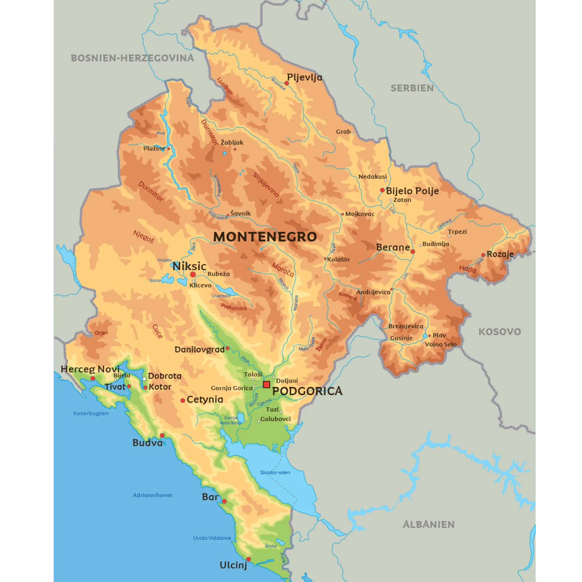 Herunder kan du se et kort over Montenegro. Start din udforskning af det lille bjergrige land her og se blandt andet placeringen af hovedstaden Podgorica og kystbyen Budva med den smukke gamle bydel. Se også beliggenheden af kystbyerne Herceg Novi og Tivat, eller landets næststørste by Nikšić, der er omgivet af bjerge. Så hvor kan du se placeringen af hovedstaden Podgorica? Find det på kortet.