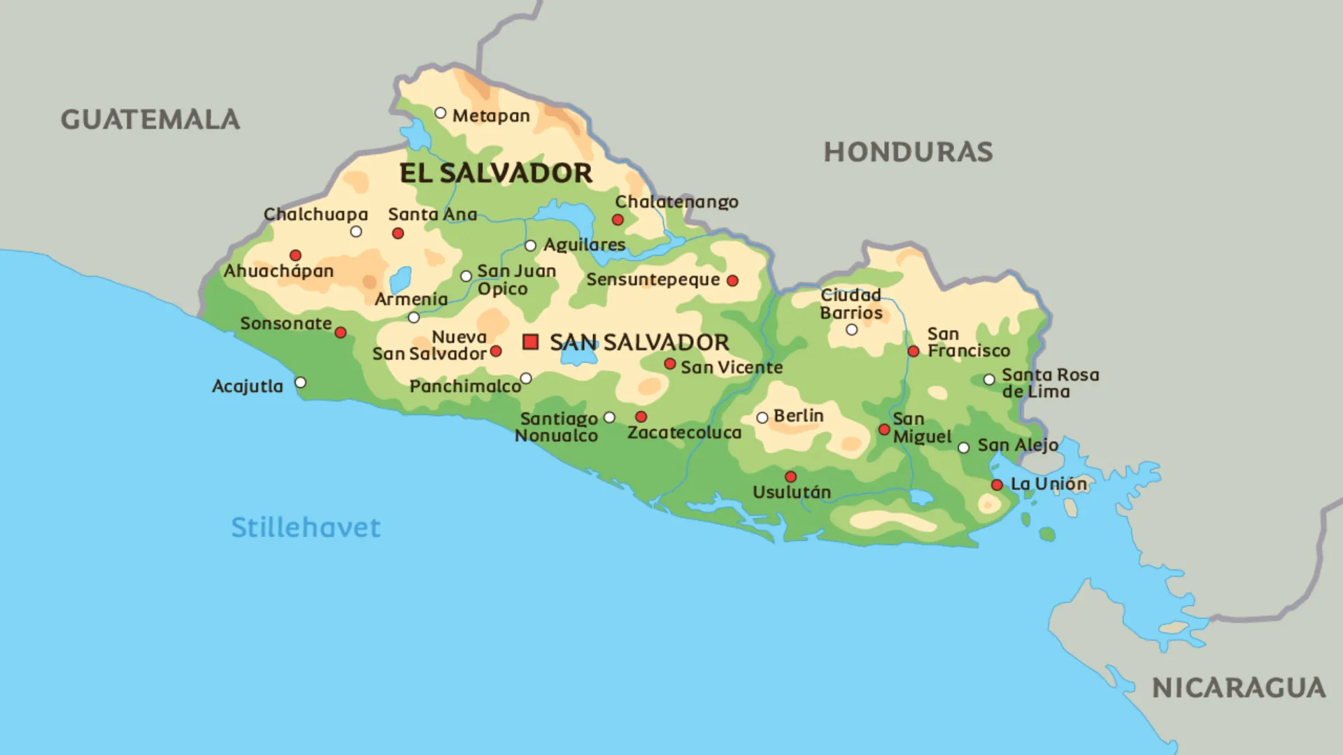 Herunder ser du kort over El Salvador. Se eksempelvis placeringen af hovedstaden San Salvador.